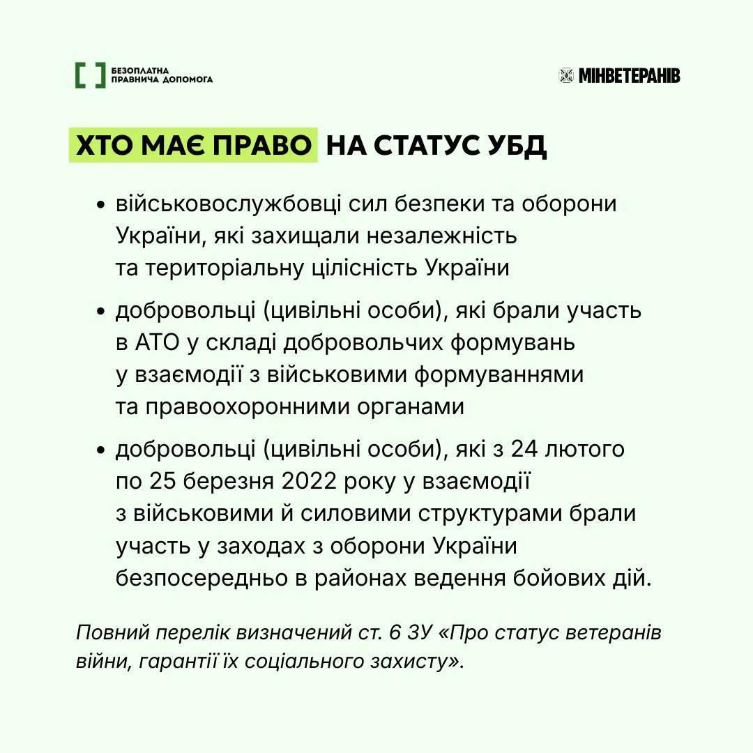 Статус учасника бойових дій (УБД) підтверджує, що особа виконувала бойові завдання у захисті України. Він надає право на пільги та гарантії держави.